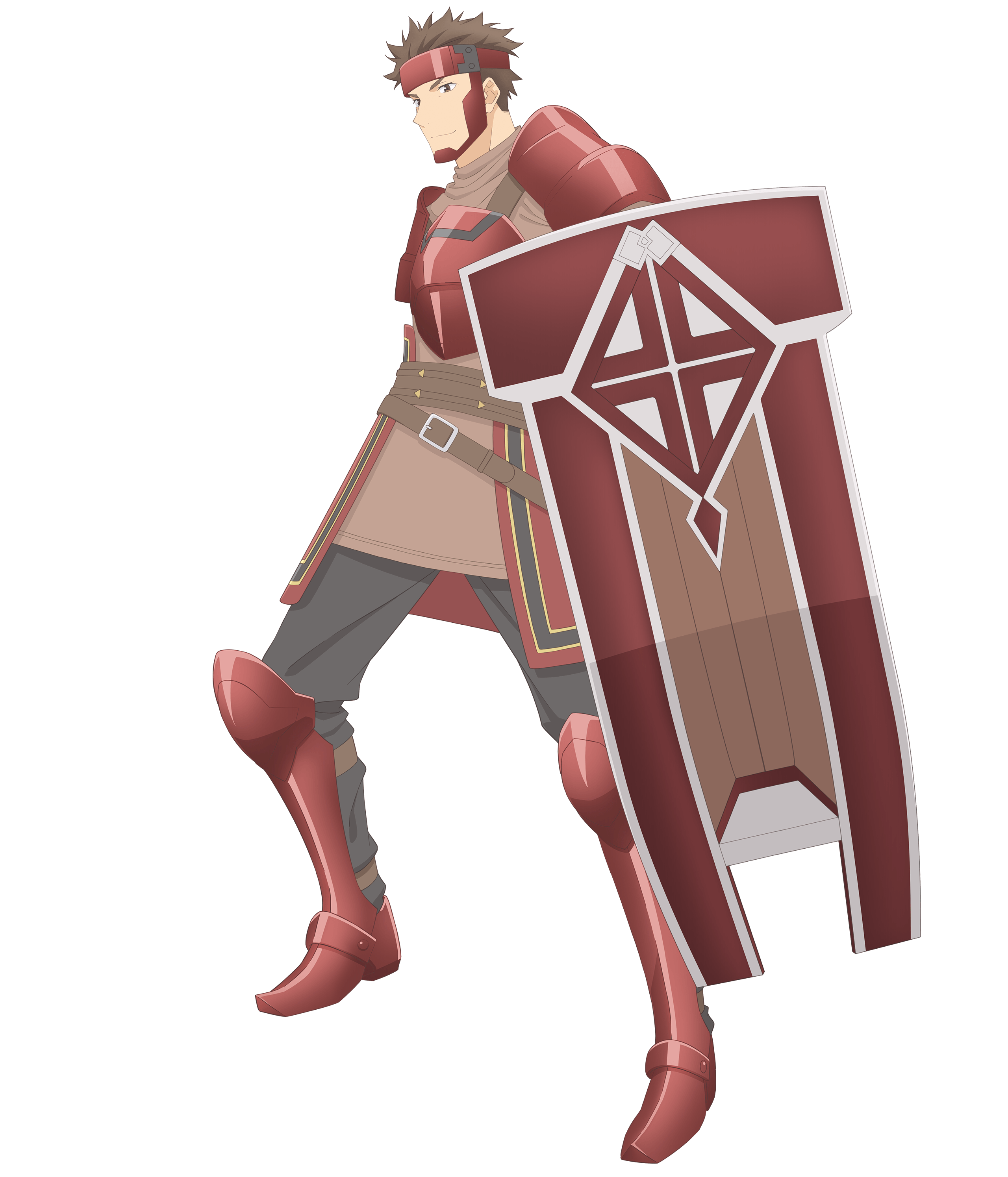 In his first appearance, his armor is maroon, and he wields a similar-colored great shield with white markings. He also wears a headpiece that protects his forehead down until his jaw. He doesn't wear that much heavy armor, clad in a light brown garb underneath a breastplate. He has shoulder pauldrons and wrist gauntlets, underneath wearing black gloves.